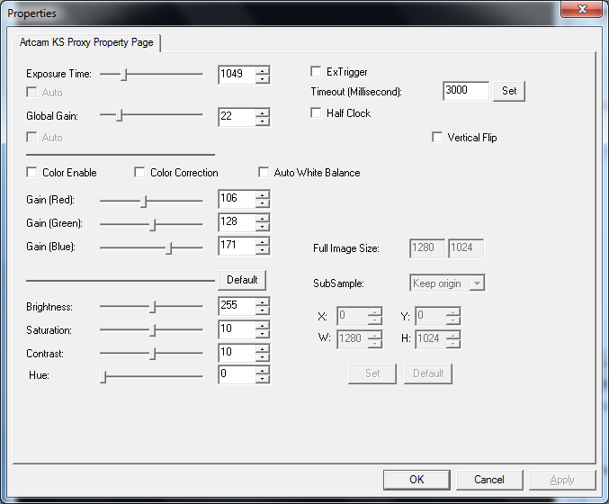 弹出摄像头设置对话框,那里可以改变曝光时间(exposure time)和增益(global gain)调节摄像头输出视频亮度。